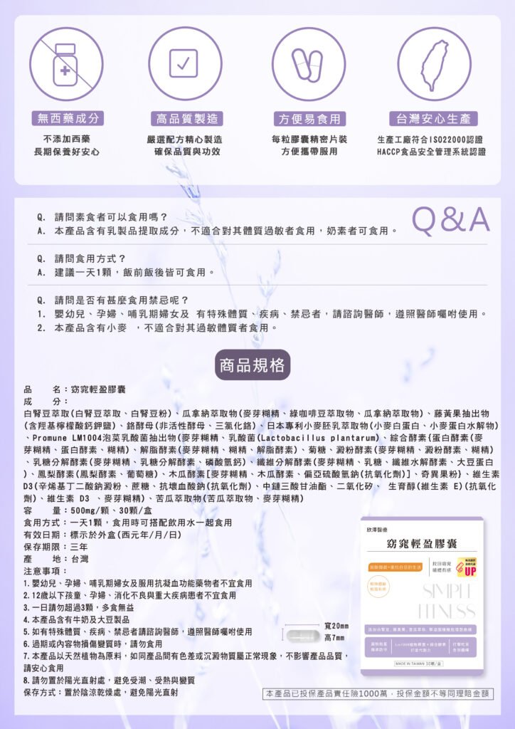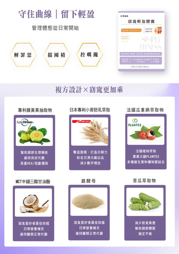 窈窕輕盈膠囊體驗包|纖體有感 燃力升級 特別添加白腎豆萃取物,結合苦瓜胜肽、藤黃果萃取與專利益生菌+半乳寡糖,多重調整配方,陪伴你輕鬆維持代謝與窈窕節奏。 嚴選白腎豆讓你享澱無憂無慮,每天一顆,打造輕盈自在的日常。 商品評價 目前沒有評價。 只有註冊並且購買過商品的顧客才能撰寫評價。