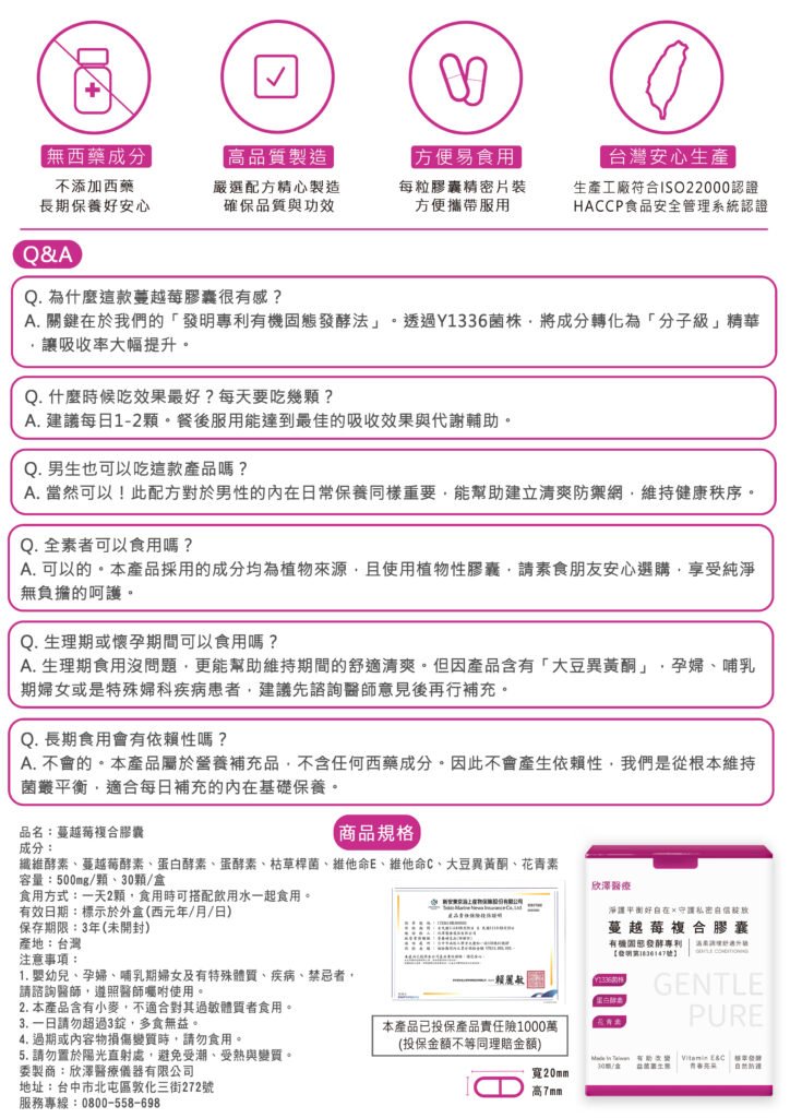 蔓越莓複合膠囊|淨護× 平衡 × 舒適升級 舒適升級新對策!結合蔓越莓酵素、枯草桿菌與多元消化酵素,強化代謝機能並建立防護屏障。 調整體質、守護私密健康。專業配方溫柔調理,是您每日維持舒爽的亮采好夥伴。 商品評價 目前沒有評價。 只有註冊並且購買過商品的顧客才能撰寫評價。